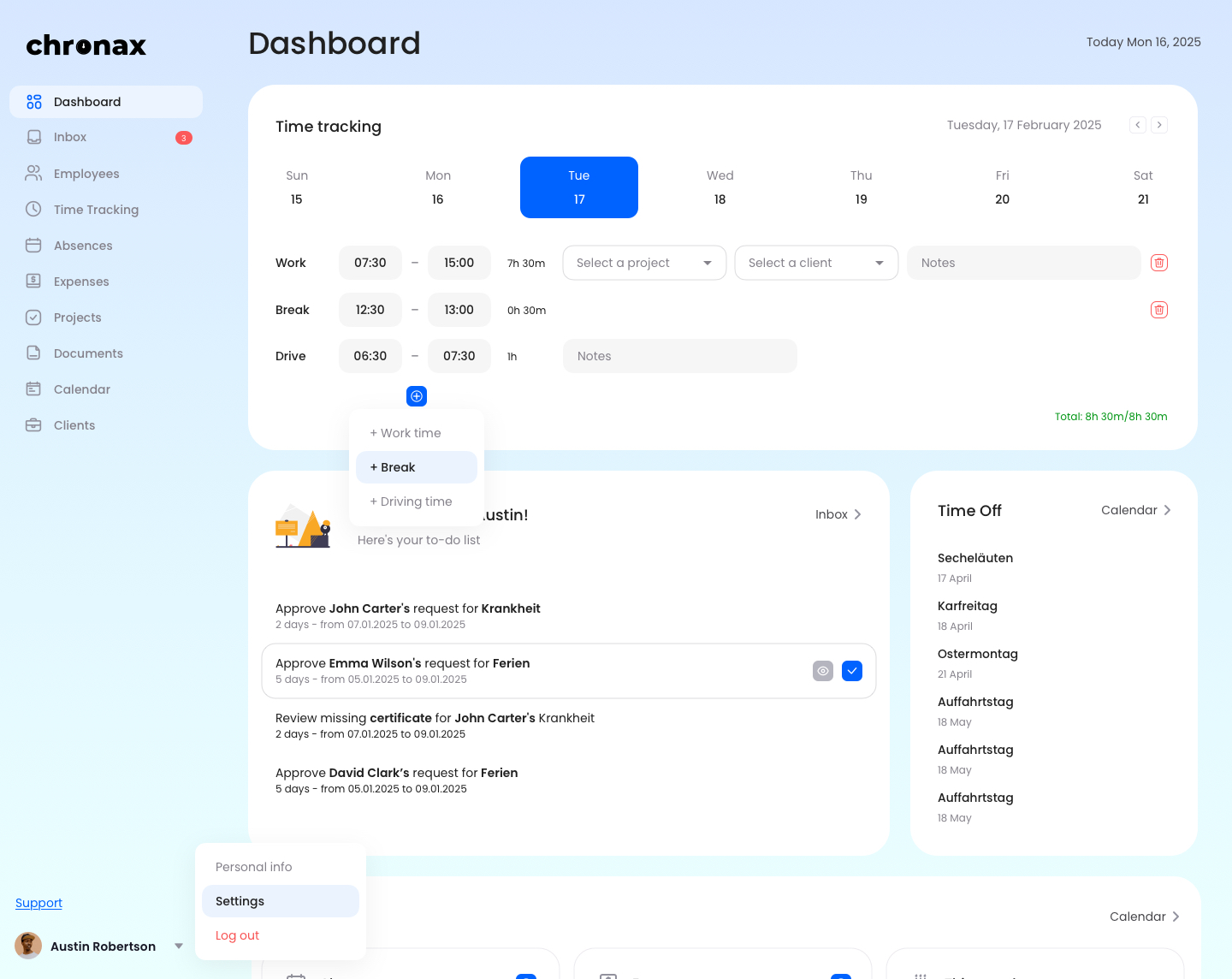 Mit Chronax organisierst du Arbeitszeiten, Abwesenheiten und Projekte deines Teams zentral an einem Ort – intuitiv, sicher und flexibel.